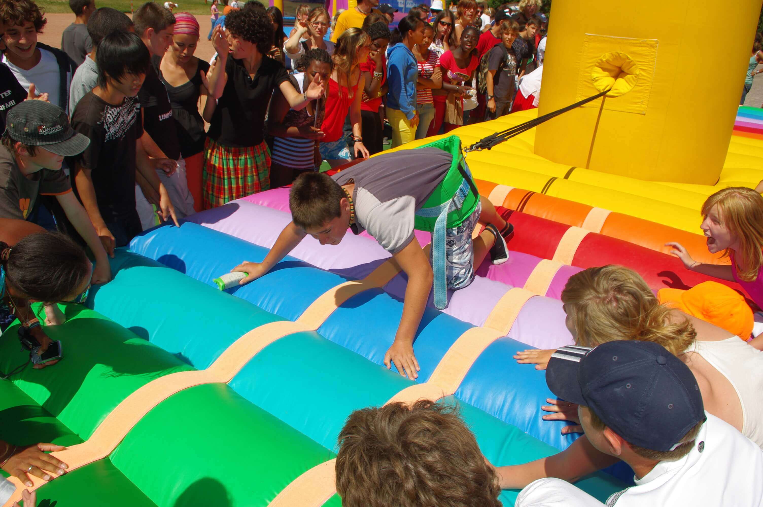 Les 2 participants sont reliés aux extrémités d’un même élastique, l’objectif étant d’aller placer son témoin velcro le plus loin possible, mais chacun des joueurs se dirigeant dans une direction différente. Un savant mélange de force et de ruse seront nécessaires pour arriver à ses fins.